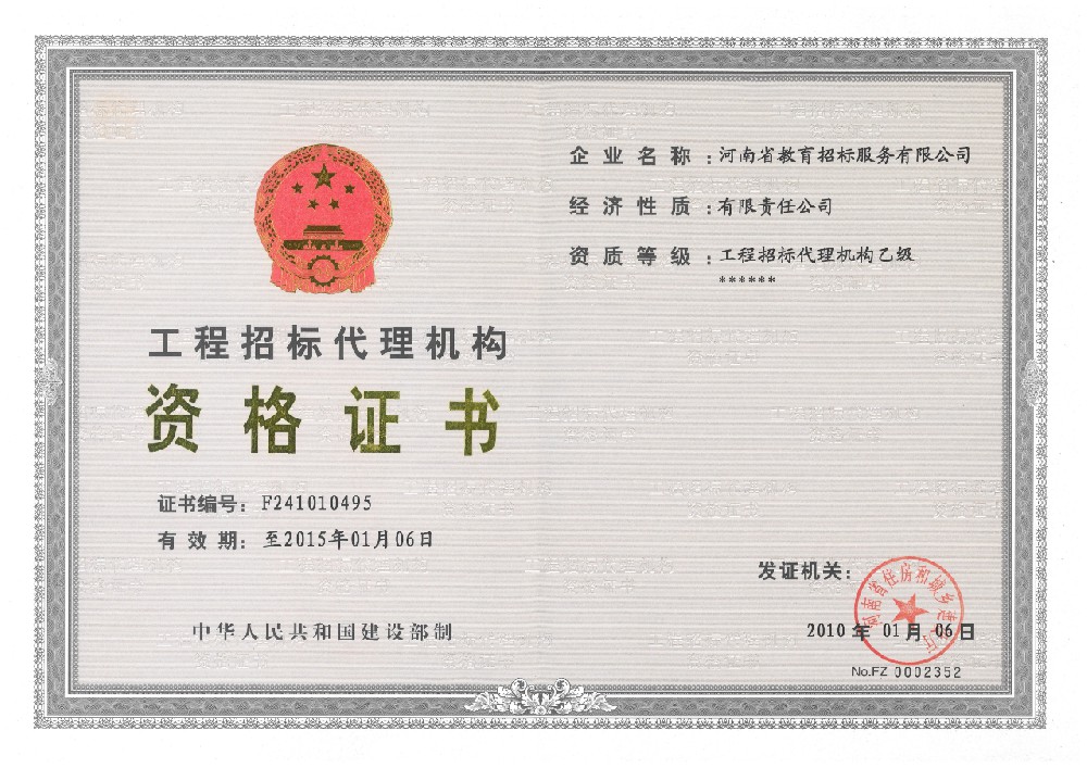 河南省教育招標(biāo)服務(wù)有限公司于2001年5月在河南省工商行政管理局注冊登記成立,具有獨(dú)立法人資格,注冊資本1000萬元人民幣,擁有中華人民共和國政府采購招標(biāo)代理甲級(jí)和工程招標(biāo)代理乙級(jí)雙重資質(zhì),并通過質(zhì)量管理體系認(rèn)證、環(huán)境管理體系認(rèn)證、職業(yè)健康安全管理體系認(rèn)證和榮獲AAA信用評(píng)估。能夠承辦政府采購代理業(yè)務(wù)及政府采購咨詢服務(wù)、工程招標(biāo)代理業(yè)務(wù)、水利招標(biāo)等業(yè)務(wù)的社會(huì)中介組織。
